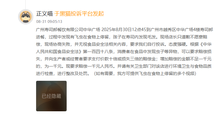 广州中华广场店顾客发觉寿司上有飞虫及毛发,济南店线上预定一度排到一个多月后。社交上有网友反映金枪鱼大腩仍正在售。列队记载刷新至14小时;